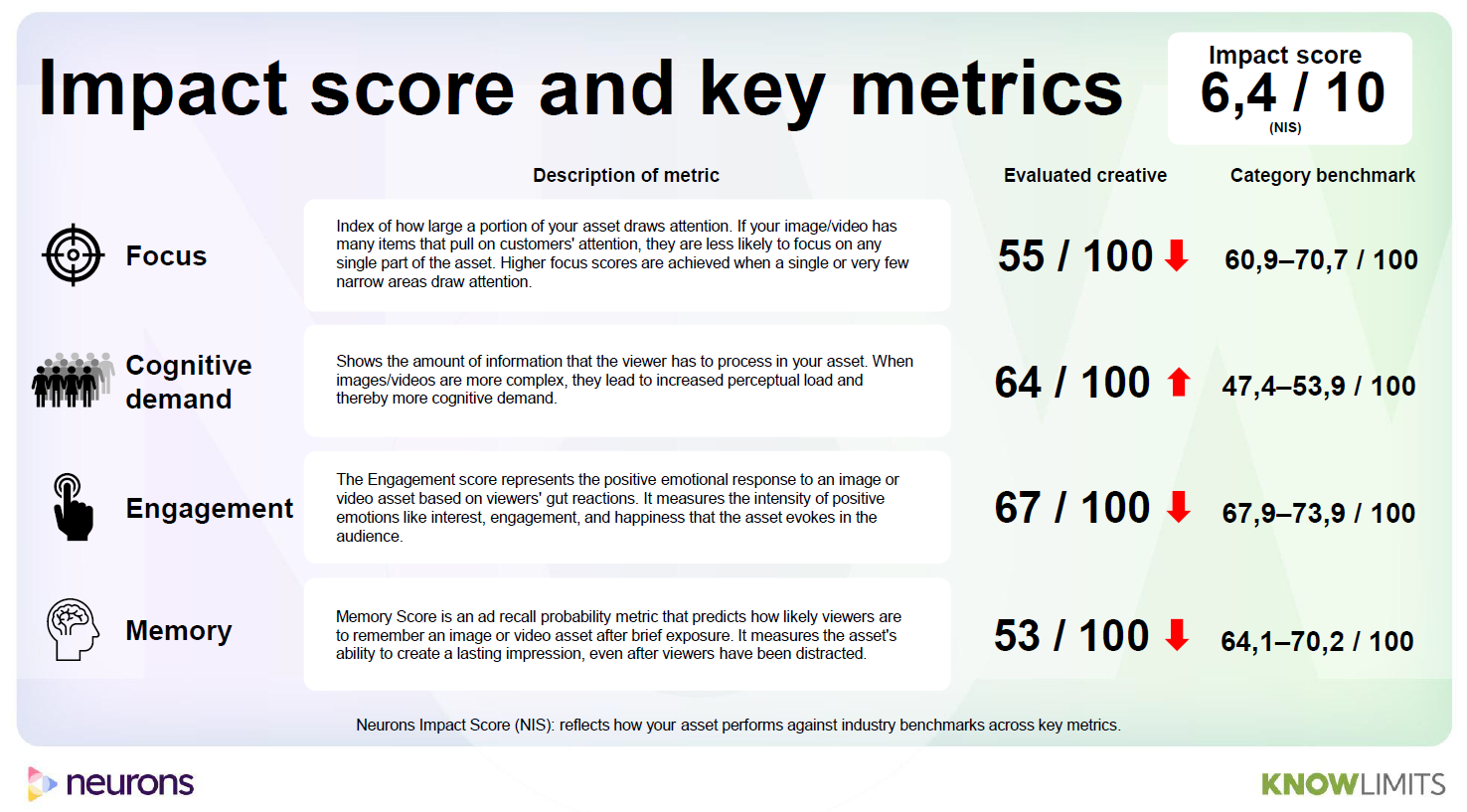 Tradiční testování kampaní je často časově náročné a finančně nákladné. Neurons AI nabízí rychlý, dostupný a přesný způsob, jak ověřit účinnost kampaně ještě před jejím spuštěním. Můžete tak optimalizovat své vizuály, zvýšit účinnost investic do reklamy a lépe porozumět tomu, jak publikum vnímá vaši značku.