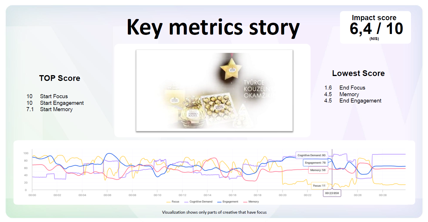Při měření kampaně pro známého výrobce ze segmentu cukrovinek jsme zjistili, že pozornost diváků byla soustředěná především na centrální postavy a produkty. Diváci se velmi dobře soustředili na vizuální znázornění chuti a atributů produktů, zatímco nejnáročnější částí kreativy byly momenty, kdy se objevilo více produktů najednou.